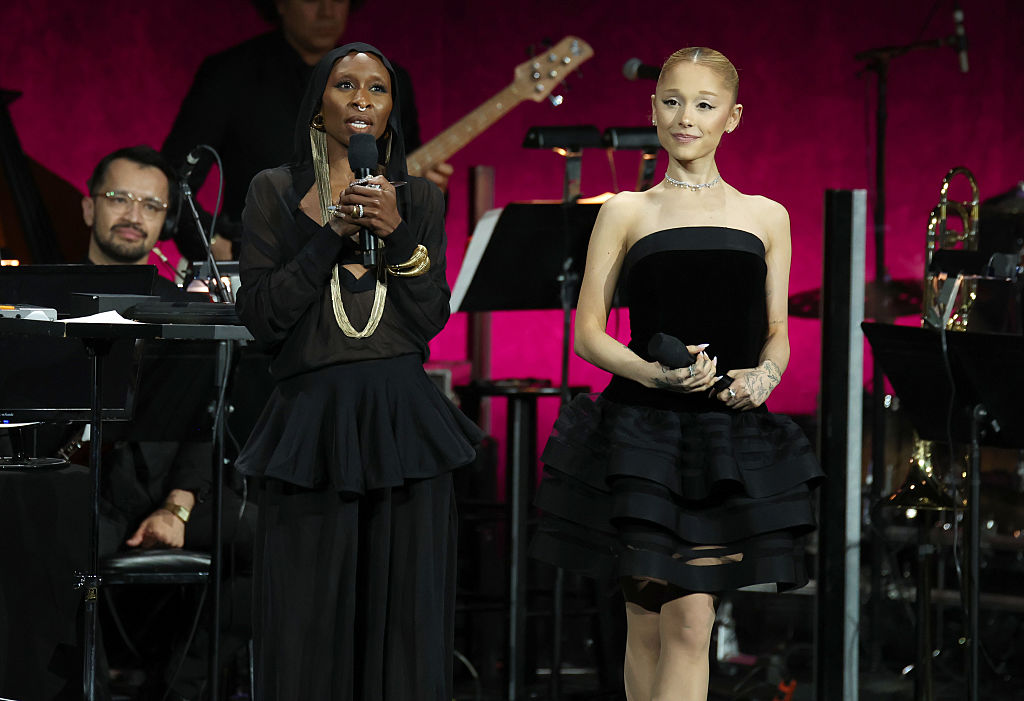 Grande’s ponytail is secured high on her head with a blunt chop that ends at her shoulders, featuring a unique color transition from warm roots to platinum and lilac ends.